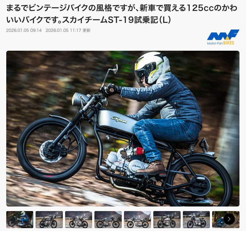 -2026.1.5-WEBのバイクサイト『モーターファンバイクス』にSKYTEAM ST-19の記事が掲載されました。-試乗車種-SKYTEAM ST-19https://motor-fan.jp/?p=1366810&post_type=article&preview=1&_ppp=8ac17e581f -2026.1.3-WEBのバイクサイト『モーターファンバイクス』に、AJS・スクランブラー250の試乗体験記事が掲載されました。-試乗車種-AJS・スクランブラー250https://motor-fan.jp/article/1360489/ – 2024.3.11 –WEBのバイクサイト『モーターファンバイクス』にAJSとACE125の記事が掲載されました。- 試乗車種 -DesertScrambler125https://motor-fan.jp/bikes/article/100180/TempestScrambler125https://motor-fan.jp/bikes/article/100134/Cadwel125https://motor-fan.jp/bikes/article/100088/ACE125Shttps://motor-fan.jp/bikes/article/100305/ – 2020.2.8 –モトチャンプ 2020年3月号に掲載されました。– 掲載車種 –AJS TempestScrambler125